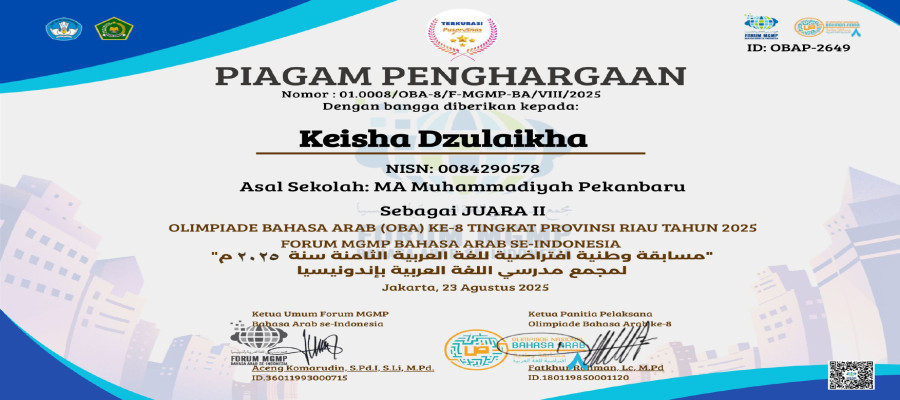 MA Muhammadiyah Pekanbaru kembali menorehkan prestasi gemilang pada ajang Olimpiade Bahasa Arab (OBA). Setelah pengumuman juara tingkat kota yang dilaksanakan di SD-SMP IT Andalus Pekanbaru, dua perwakilan MA Muhammadiyah berhasil meraih Juara 2 dan Juara