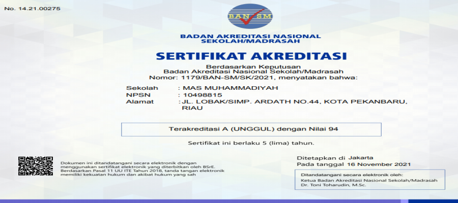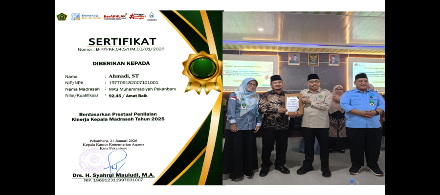 Pekanbaru--MA Muhammadiyah Pekanbaru menyampaikan ucapan selamat dan sukses kepada Bapak Ahmadi, ST selaku Kepala MA Muhammadiyah Pekanbaru atas capaian prestasi mem