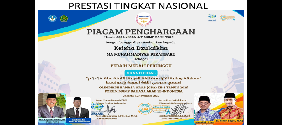 MA Muhammadiyah Pekanbaru kembali menorehkan prestasi gemilang pada ajang Olimpiade Bahasa Arab (OBA). Setelah pengumuman juara tingkat kota yang dilaksanakan di SD-SMP IT Andalus Pekanbaru, dua perwakilan MA Muhammadiyah berhasil meraih Juara 2 dan Juara