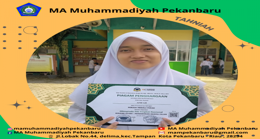 Siswi MA Muhammadiyah pekanbaru atas nama AFIFAH kelas XII IPS 1 meraih medali Perak pada Pelaksanaan Olimpiade PAI tingkat nasional tahun 2023 bidang studi PAI, yang diselenggarakan oleh Oimpiade Indonesia. Alhamdulillah.....